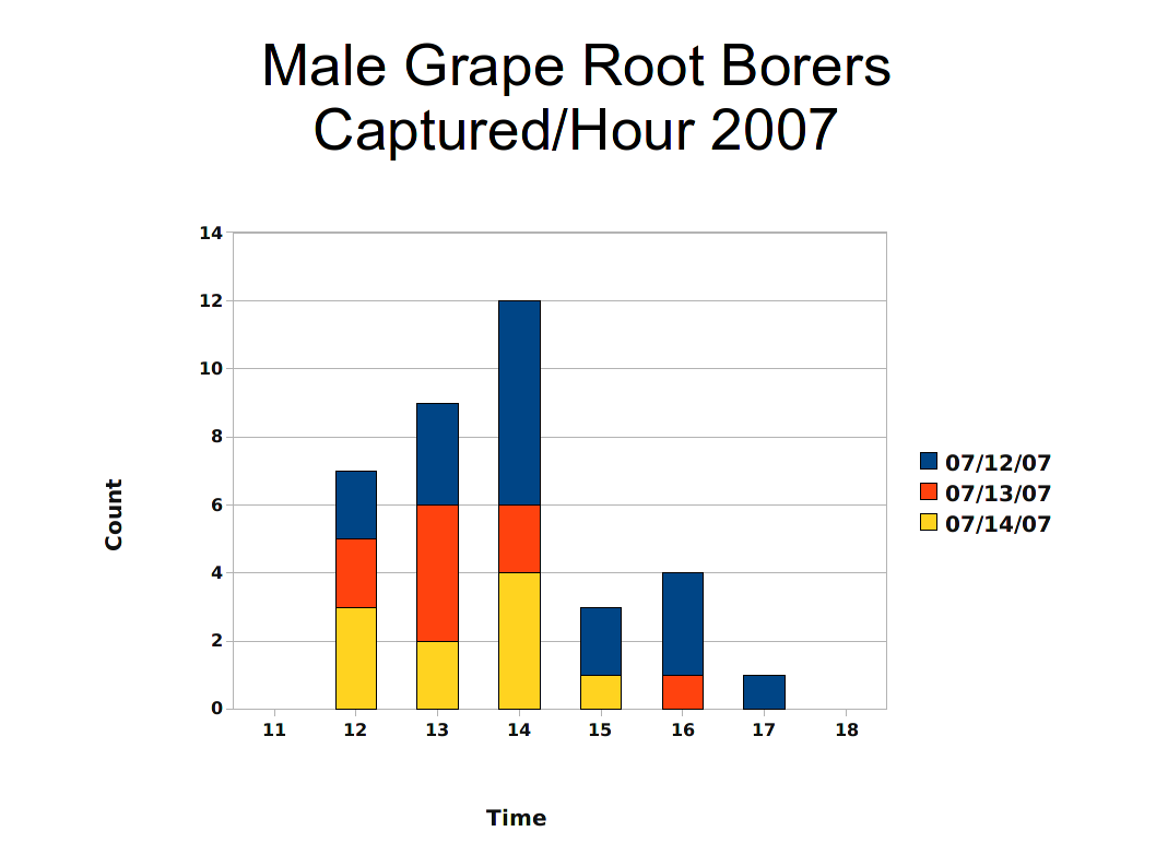 The life cycle of grape root borers make them difficult to control. In southeastern Pennsylvania, adults usually begin to emerge about the 1st of July and continue to emerge into mid or late August. The peak time for emergence of males is usually in mid-July. Adult moths live about 1 to 2 weeks and do not consume any food. Insecticides commonly used in the vineyard have no effect on grape root borer populations. Adult grape root borers are present in the vineyard at the same time as Japanese beetles, but are not affected by the sprays. The moths are most active in the afternoon and mating also occurs during this time. Male moths are most commonly seen flying about the vineyard. Females are usually sitting in vines or vegetation in the vineyard and fly sporadically. Consequently few females are observed as compared to males, although the number of males to females is usually equal. 5